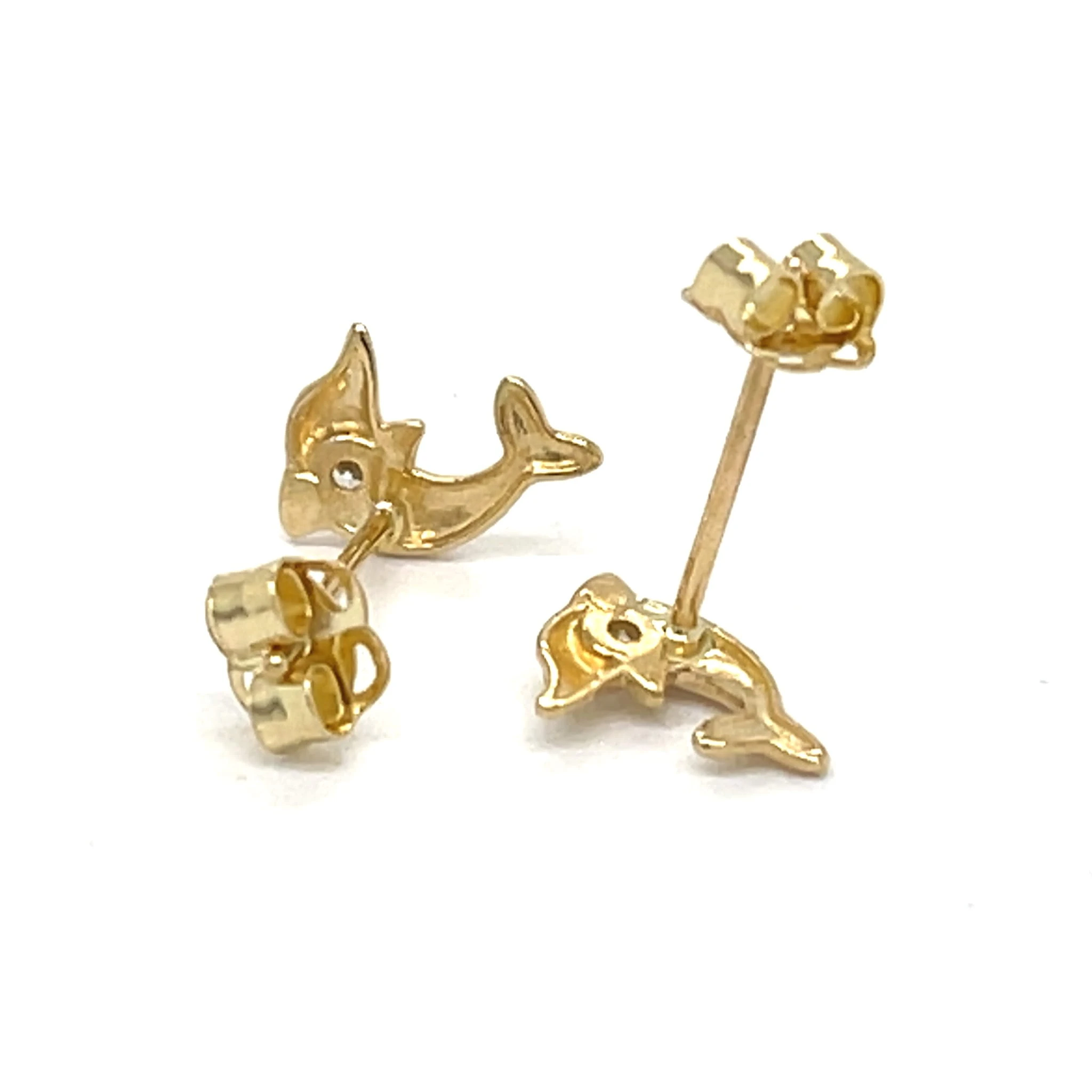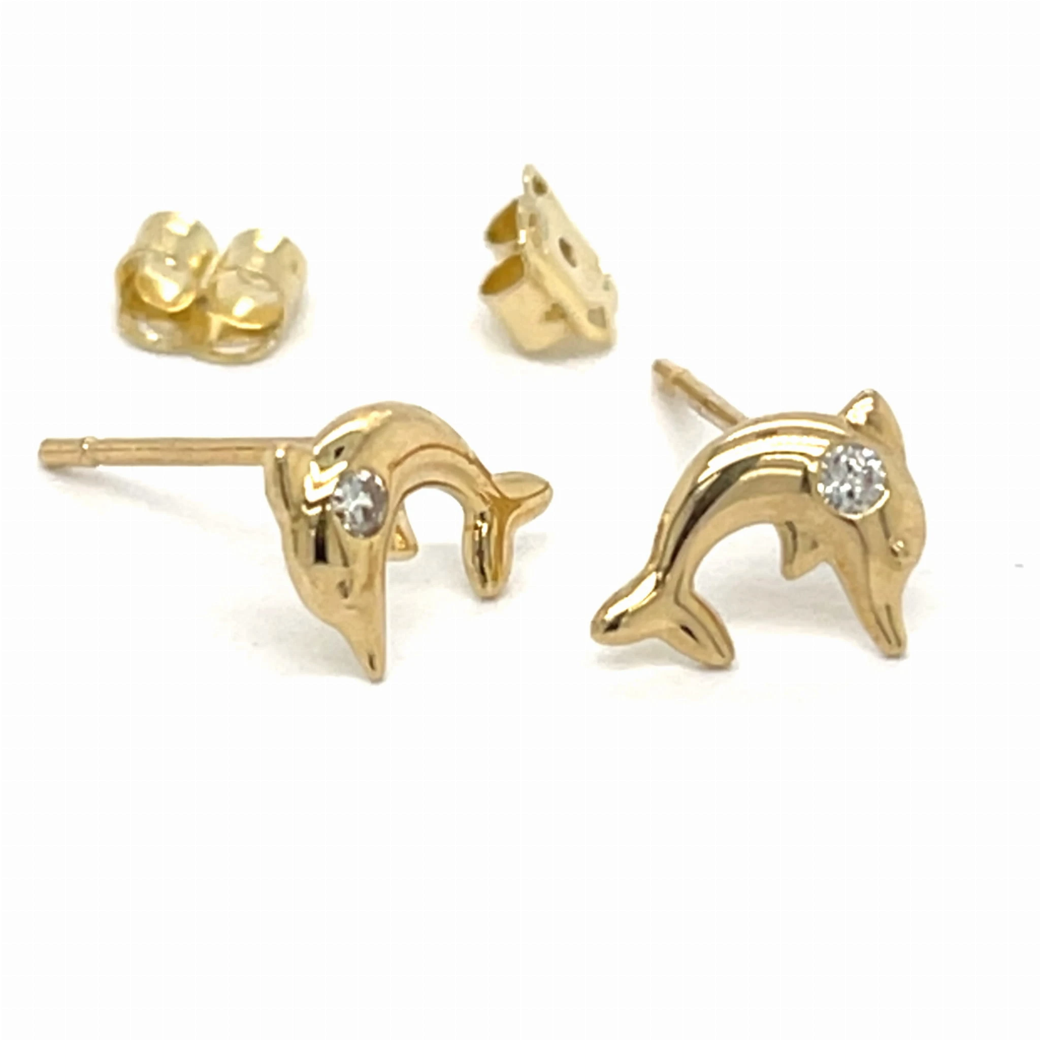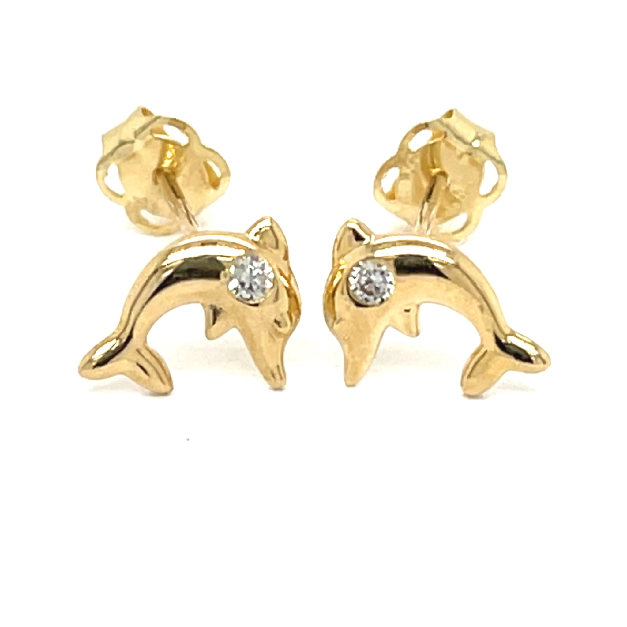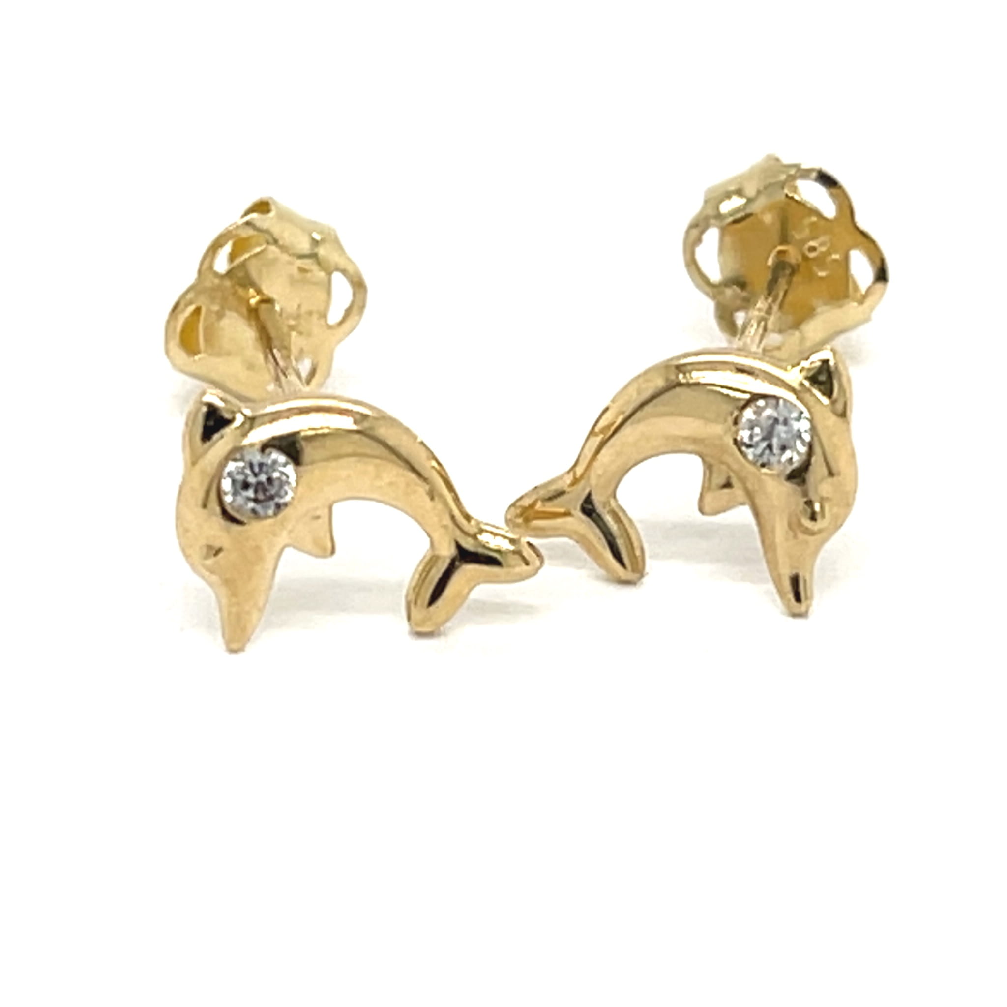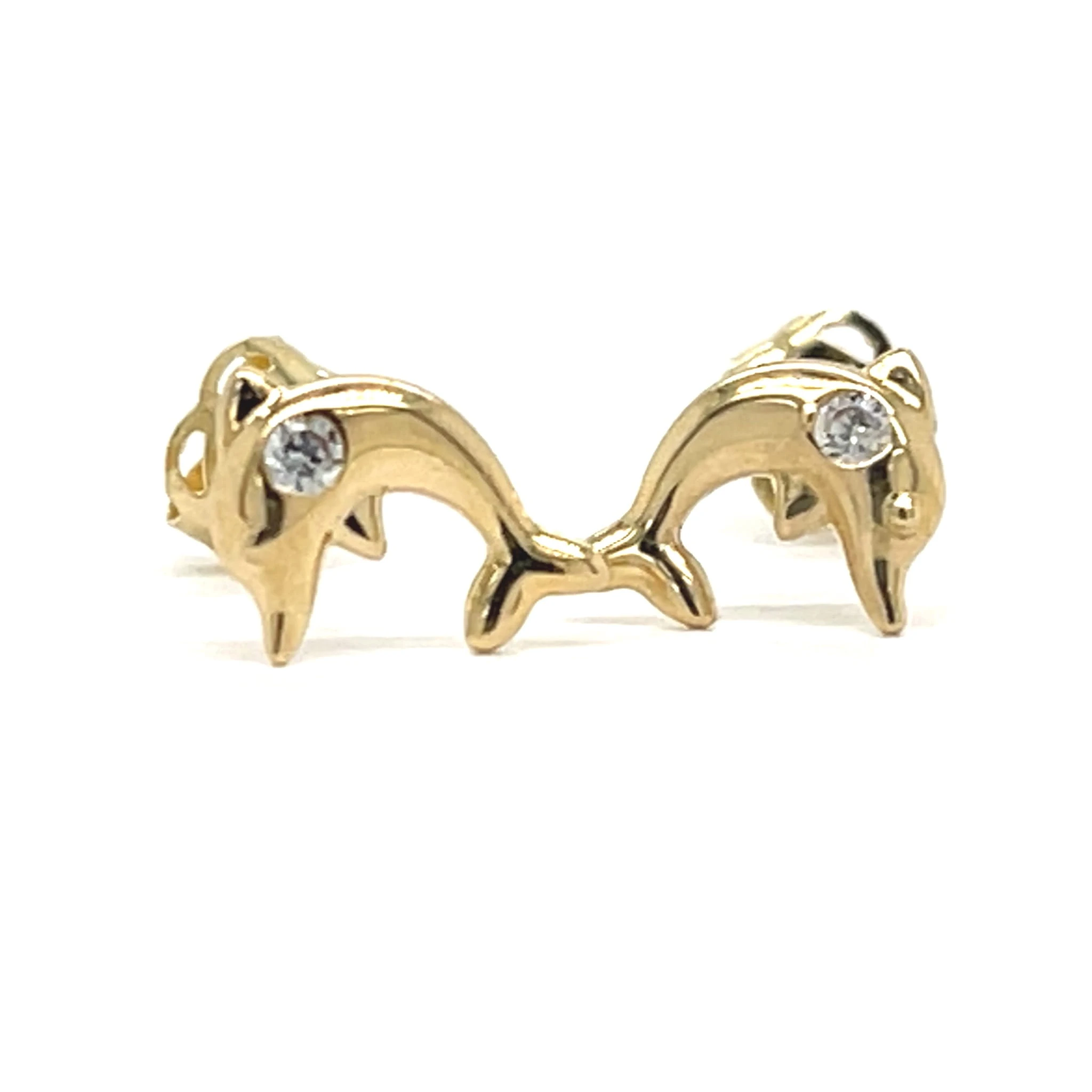 Dziecięce Kolczyki Sztyfty Złote 585 - Delfiny z Białymi Cyrkoniami